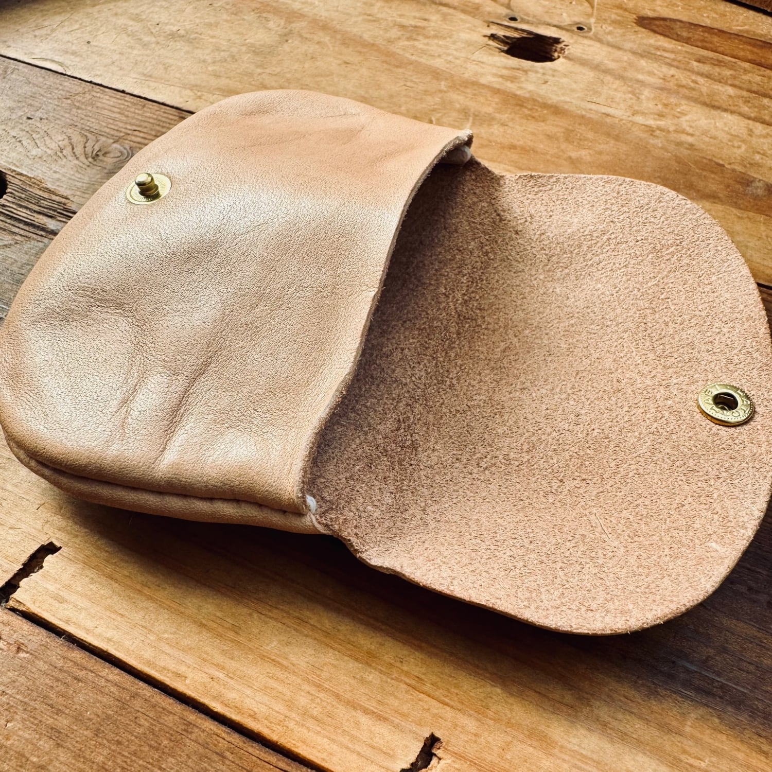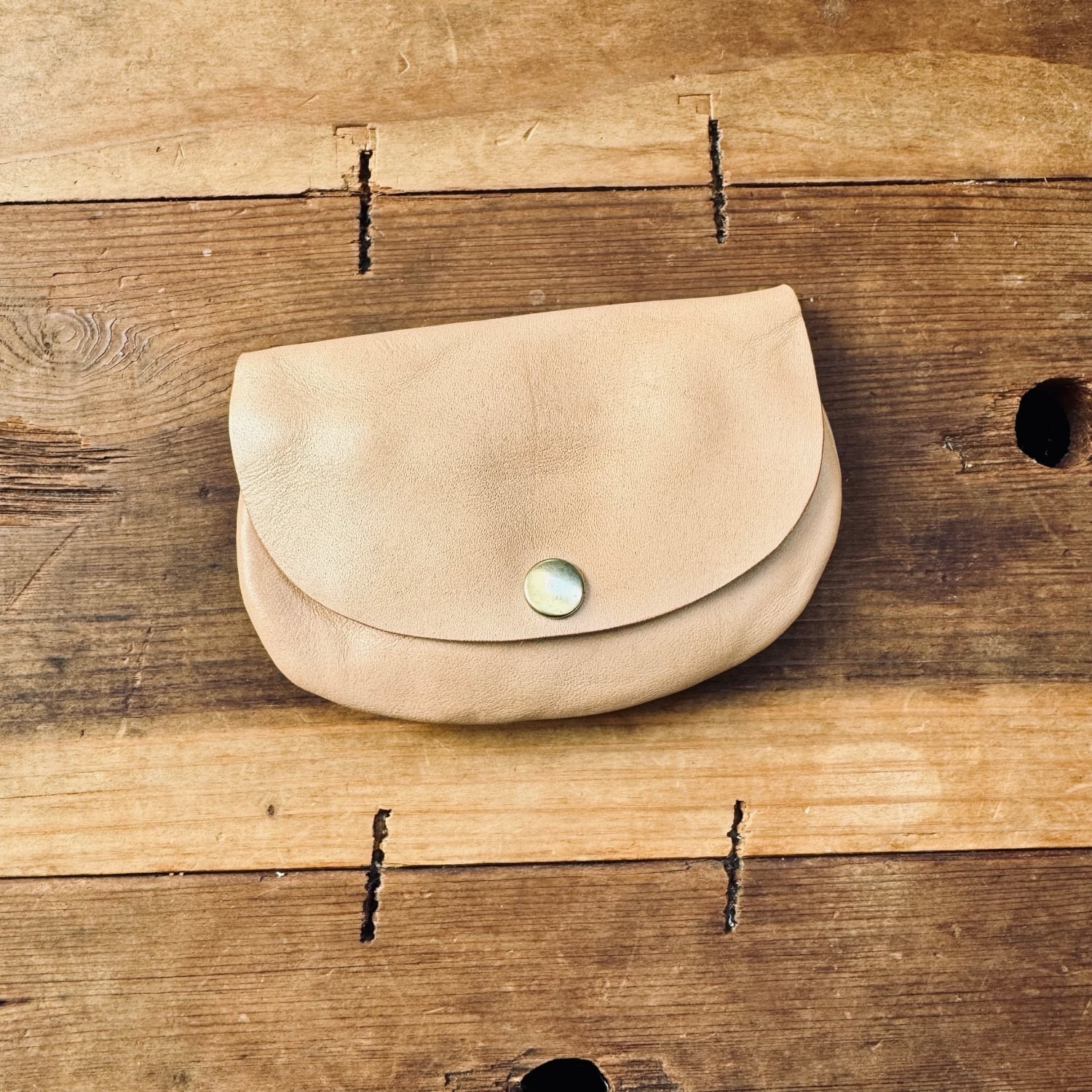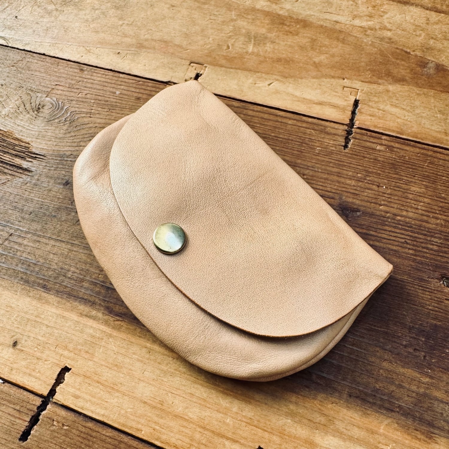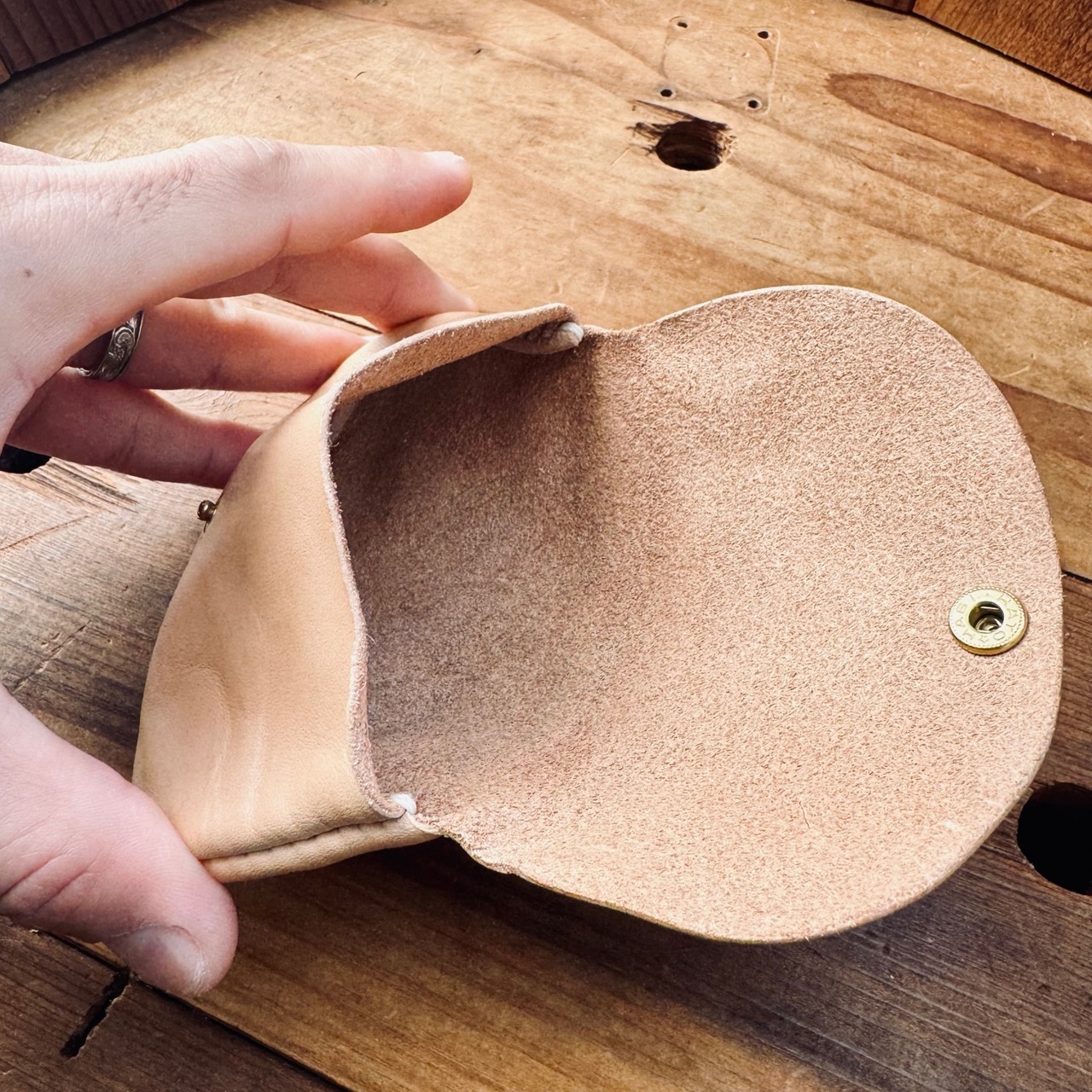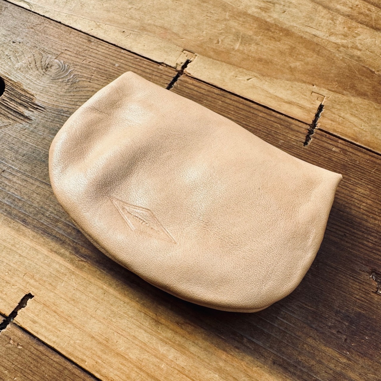 ヌメ革の手のひらに収まるサイズのポーチです。