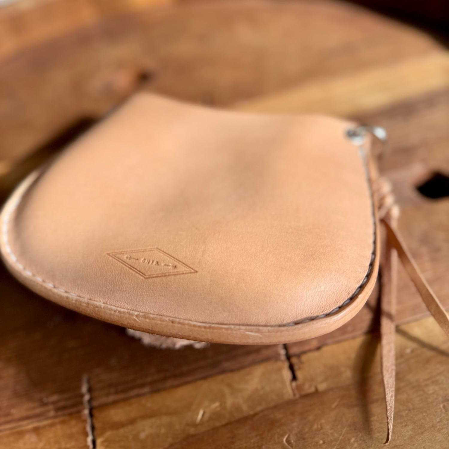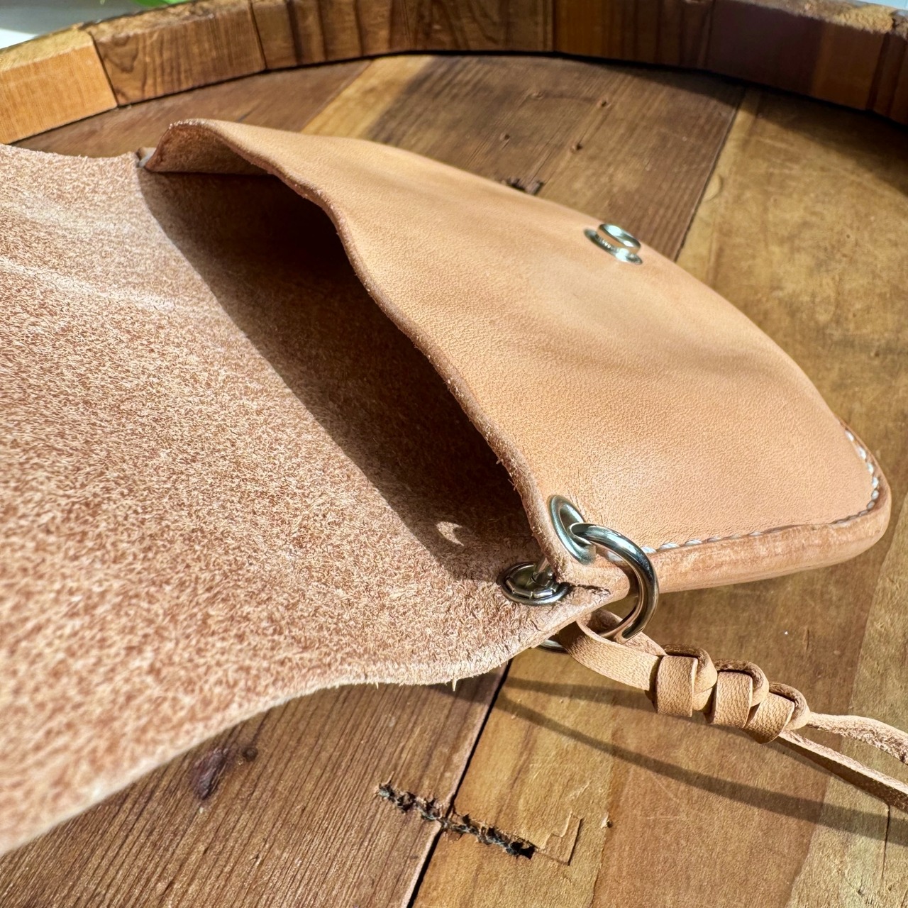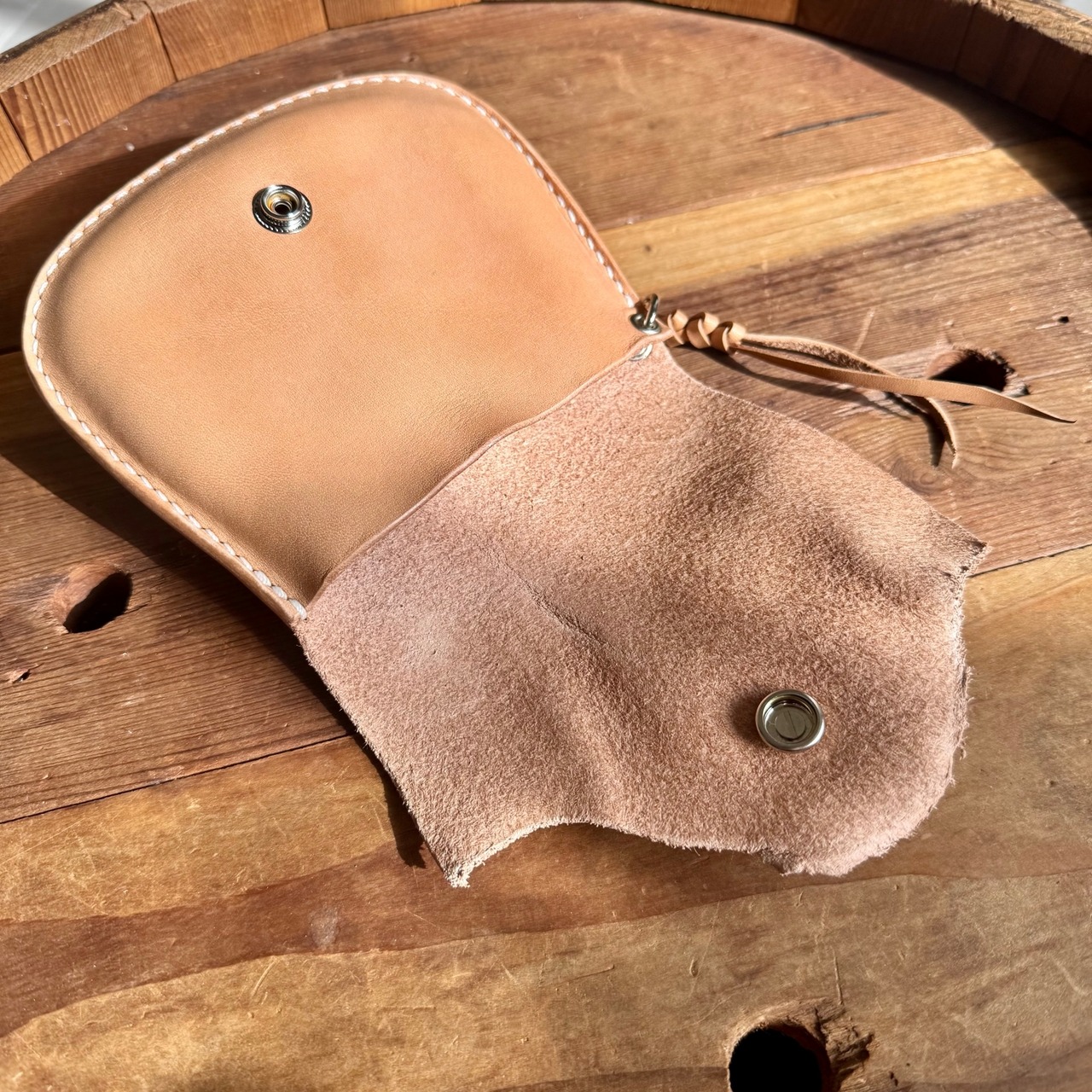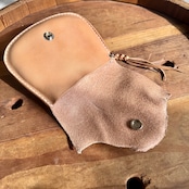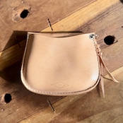 ヌメ革の大きな半裁の一部分からしか取れない切れ端の表情を利用したポーチです。