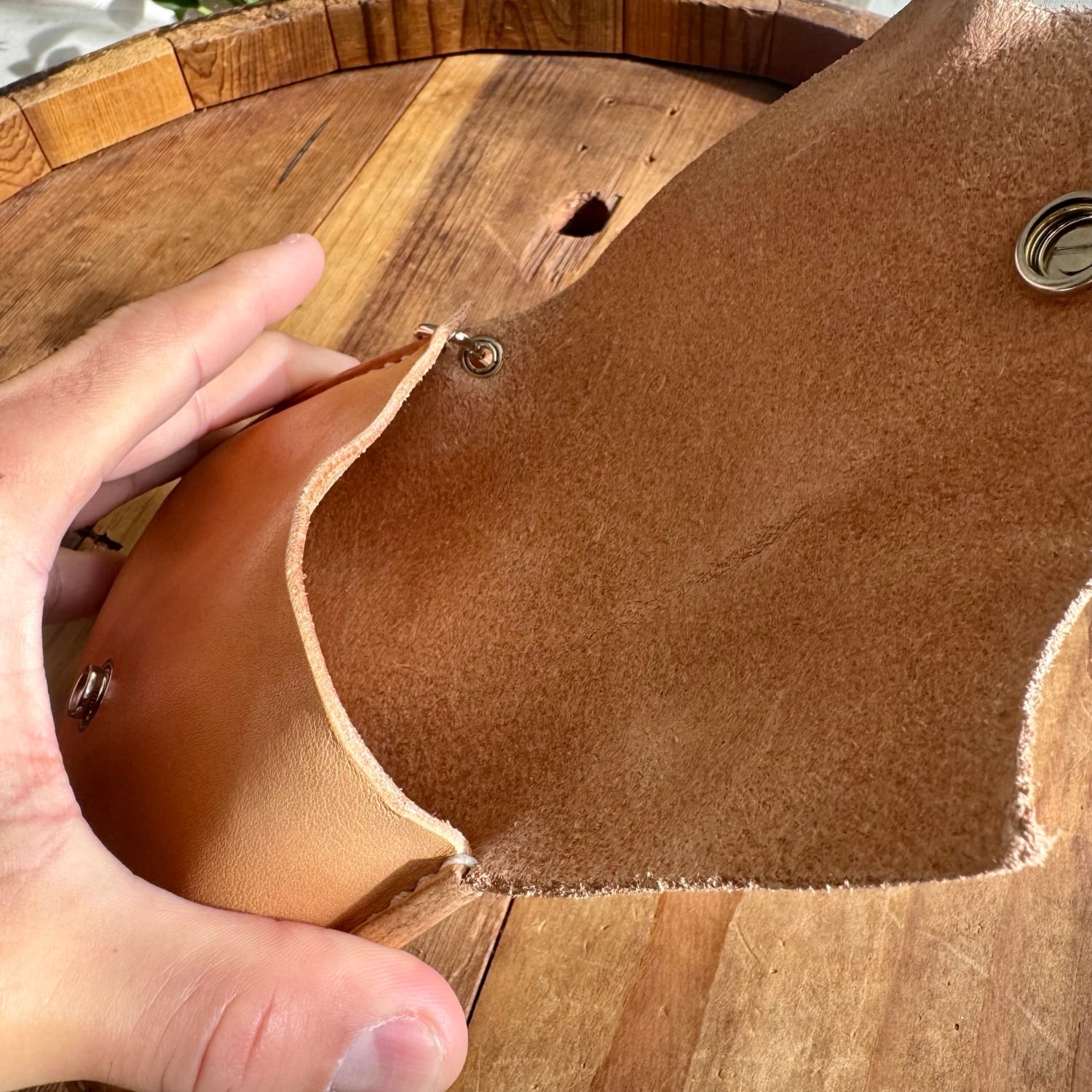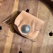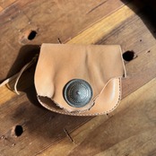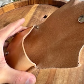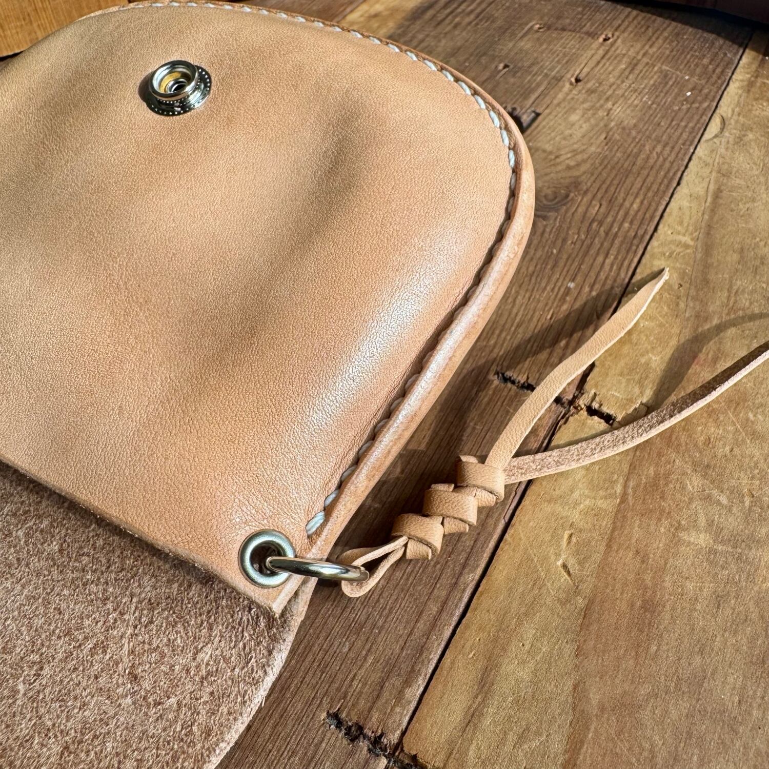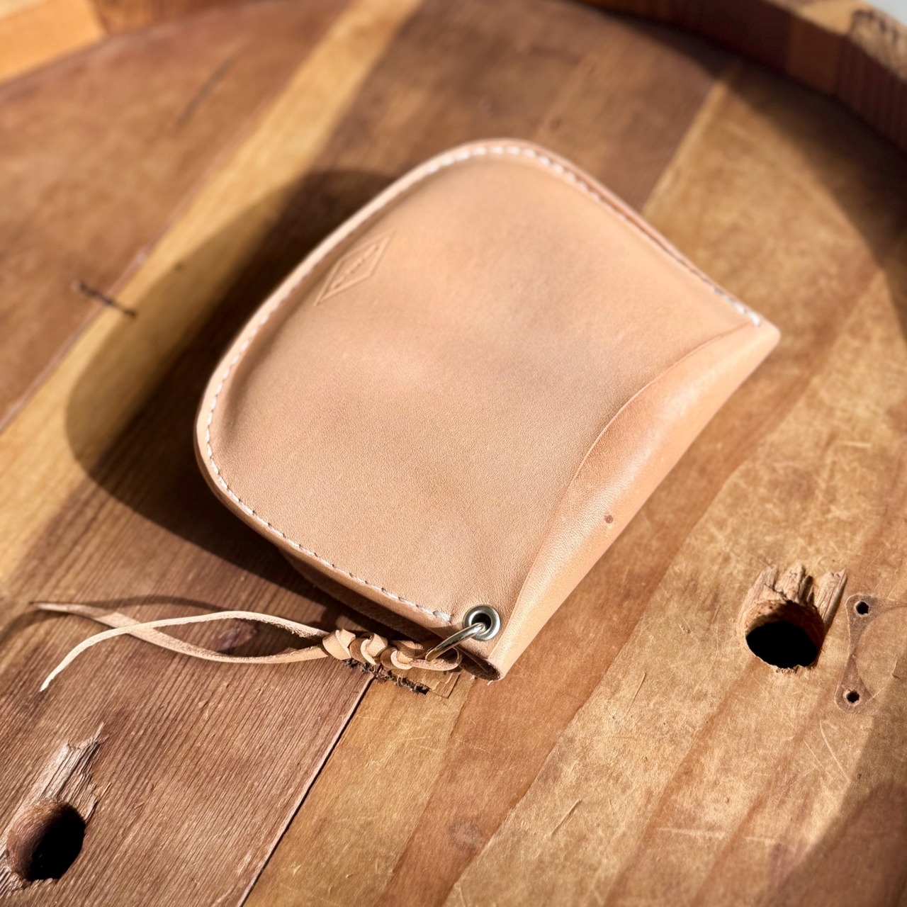 ヌメ革の大きな半裁の一部分からしか取れない切れ端の表情を利用したポーチです。